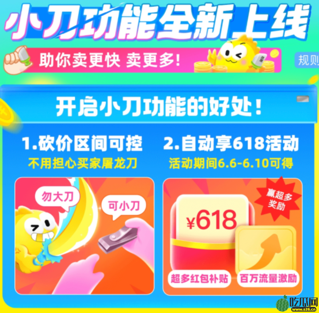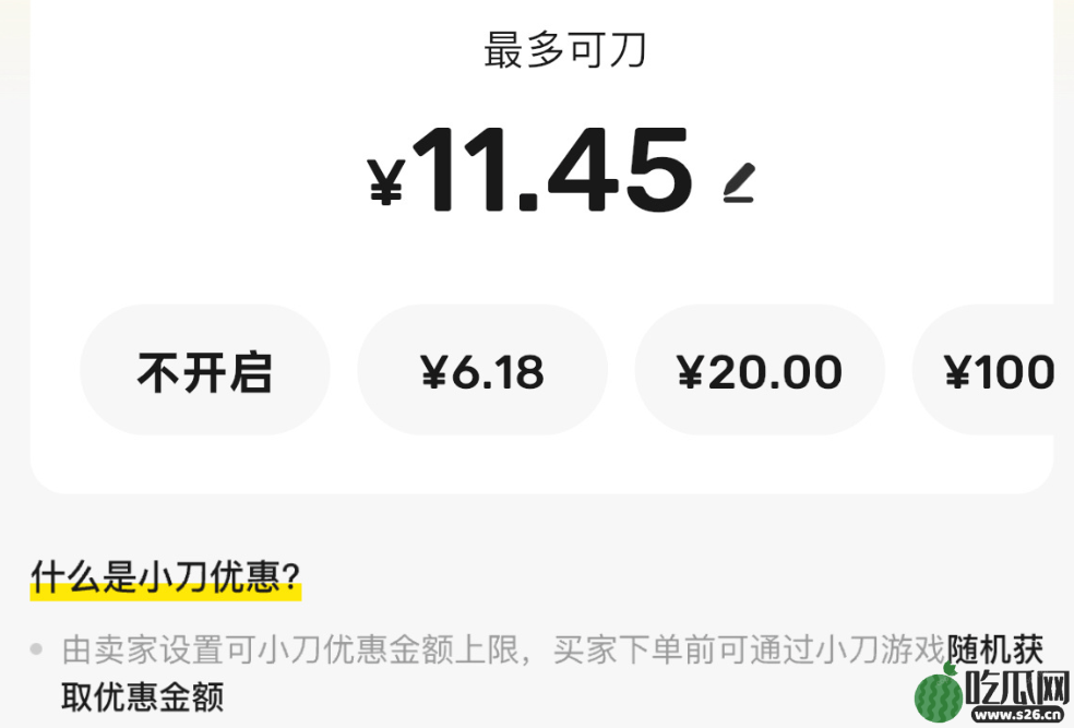 官方描述称“卖家可在商品目录中设置小刀优惠金额上限,买家下单前可通过小刀游戏随机获取优惠金额”。文章源自吃瓜网https://www.17gua.com/吃瓜网-https://www.17gua.com/100084.html