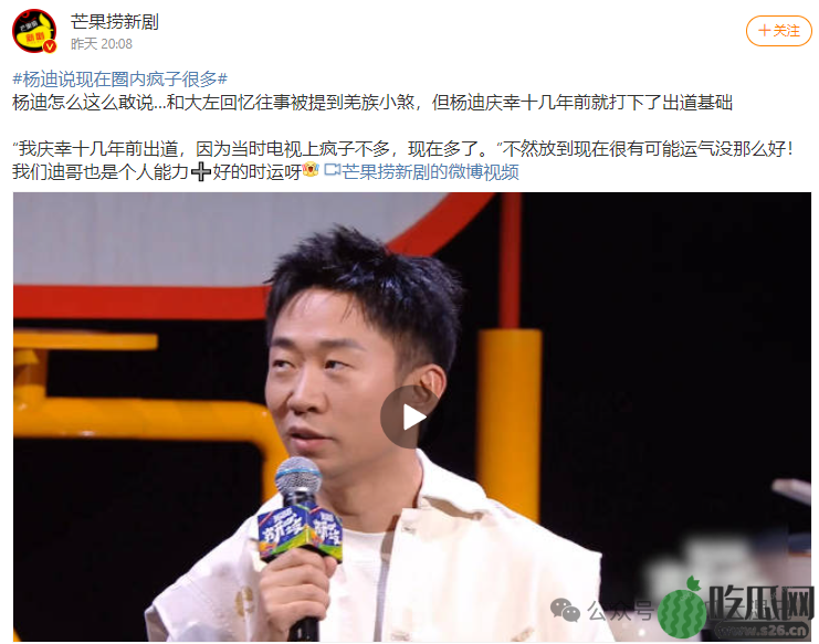 “我庆幸十几年前出道,因为当时电视上疯子不多,现在多了。”不然放到现在很有可能运气没那么好!我们迪哥也是个人能力➕好的时运呀杨迪说的挺对的,圈内确实很多疯子人设,可能这个人设比较吸粉吧,不过还要说一句,内娱比杨迪疯的确实不多,他疯的很自然