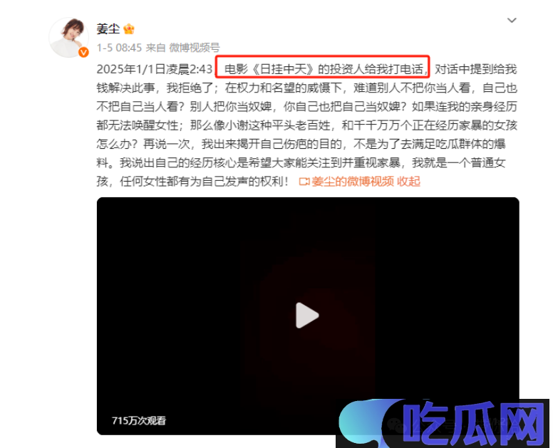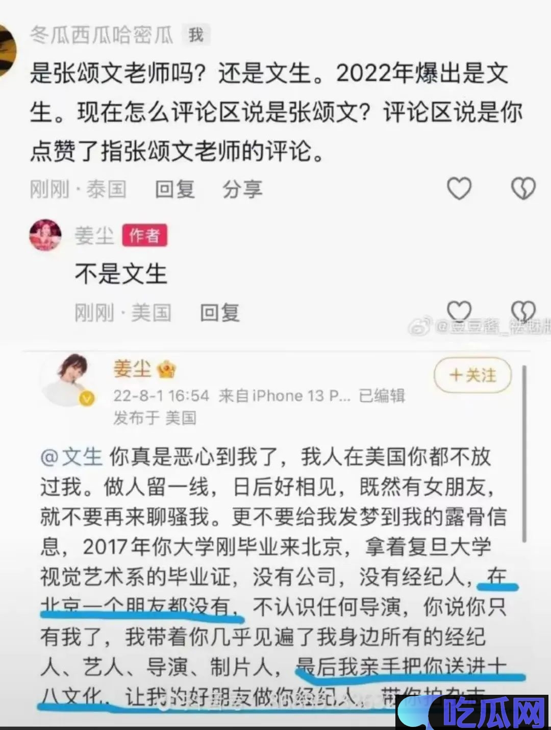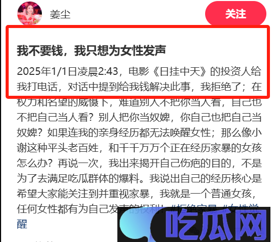 这位爆料人,名字叫姜尘,是一个40岁,移民美国的前演员。她在前段时间,先是暗示一位男明星曾经家暴他,在取得了一定的流量之后,她摊牌了。文章源自吃瓜网https://www.17gua.com/吃瓜网-https://www.17gua.com/109321.html