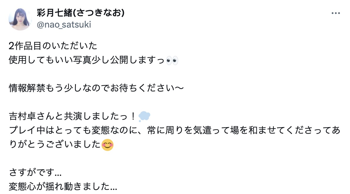 可能有人觉得这个外型看起来很猥琐的欧吉桑吃真好,不过他与彩月七緒(彩月七绪)是有些渊源的:虽然双方并不是在出道作就合作,不过在第二支作品合作的时候双方都留下的不错的印象,彩月七緒(彩月七绪)还特发文呢:文章源自吃瓜网https://www.17gua.com/吃瓜网-https://www.17gua.com/121993.html