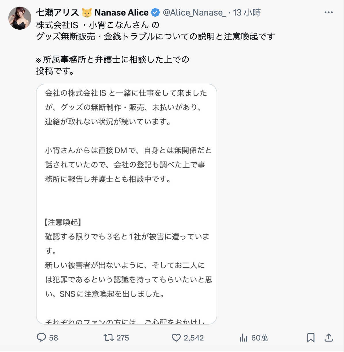 敏感一点的朋友应该就可以猜出事情和小宵こなん(小宵虎南)有关,而ami也在IG(https://www.instagram.com/ami__t1010/)的限动说此了前因后果:原来她之前的付费粉丝团也是由小宵こなん(小宵虎南)介绍的活动公司is经营,操盘人、也就是小宵的老公,名为「板津胜久」,结果和七瀬アリス(七濑爱丽丝)一样,ami同样在未经授权的情况下被发行周边商品,然后一毛钱都没拿到,更惨的是粉丝团的收入也被挪用,然后就被已读不回了⋯