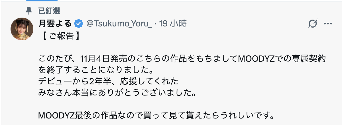 然后,月雲よる(月云夜)就要离开Moodyz了,虽然蛮震撼的甚至觉得有点可惜,不过说实在话,月雲よる(月云夜)能在这家业界最大的片商待了差不多两年半已经很强了,比较遗憾的是在这个时间点离开,代表着接下来这家正要大肆庆祝成立25周年的片商没有位子留给月雲よる(月云夜)了,她只能看着过去的同事狂欢然后希望自己下一站幸福ー