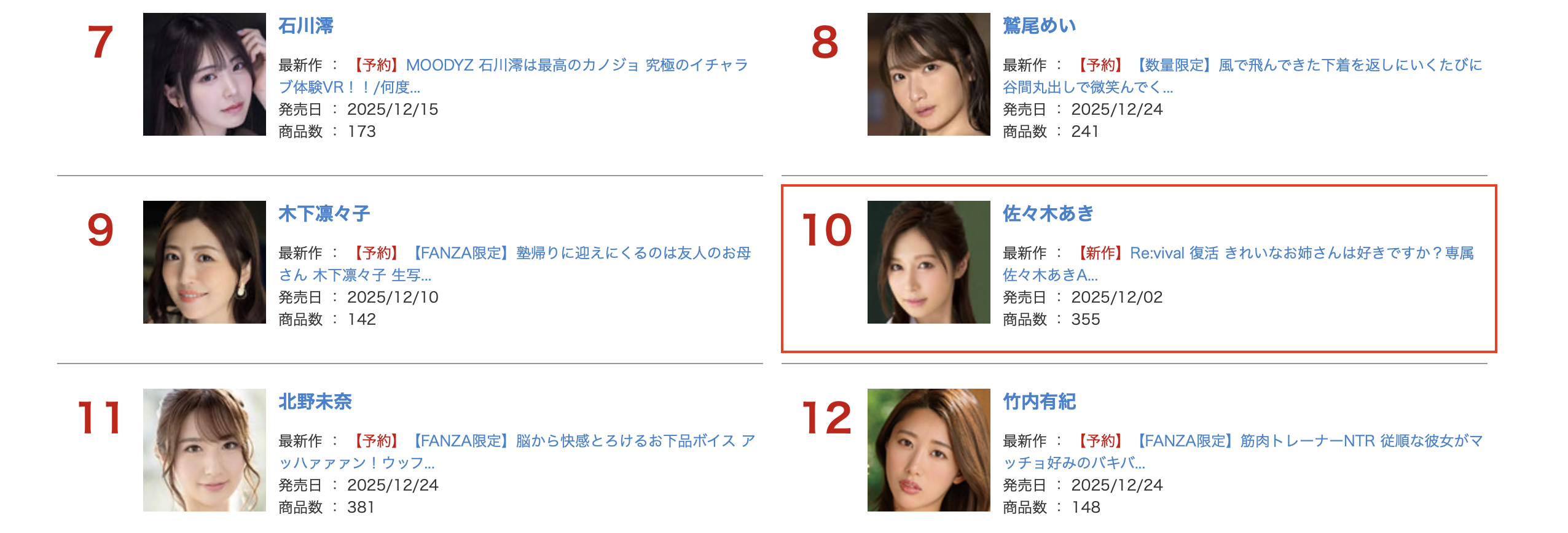再加上是久违复出,和我一样兴奋者有之、想看看老朋友现在变成什么样子的应该也很多,所以佐々木あき(佐佐木明希)这支复活作品的买气相当旺,在刚刚公佈的fanza实体作品的11月销售排行榜她拿下第6、累积销售则是第10,可说是为了M社和自己拿下来好彩头ー不过我们都知道这一行人气变化很快,初入江湖天下无敌然后没过多久寸步难行的例子太多了,佐々木あき(佐佐木明希)第一支作品打了胜仗可不能掉以轻心,因为大家都看过她现在的模样了,不喜欢的人很有可能不会再买片了,接下来就要看她的真本事惹:文章源自吃瓜网https://www.17gua.com/吃瓜网-https://www.17gua.com/125836.html