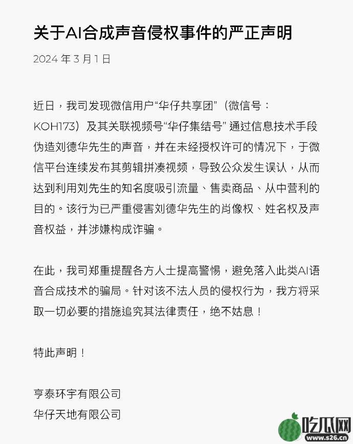 20分钟后,映艺娱乐再次发布《关于AI合成声音侵权事件的严正声明》:近日,发现微信用户“华仔共享团”(微信号:KOH173)及其关联视频号“华仔集结号”通过信息技术手段伪造刘德华先生的声音,并在未经授权许可的情况下,于微信平台连续发佈其剪辑拼凑影片,导致公众发生误认,从而达到利用刘先生的知名度吸引流量、售卖商品、从中营利的目的。该行为已严重侵害刘德华先生的肖像权、姓名权及声音权益,并涉嫌构成诈骗。