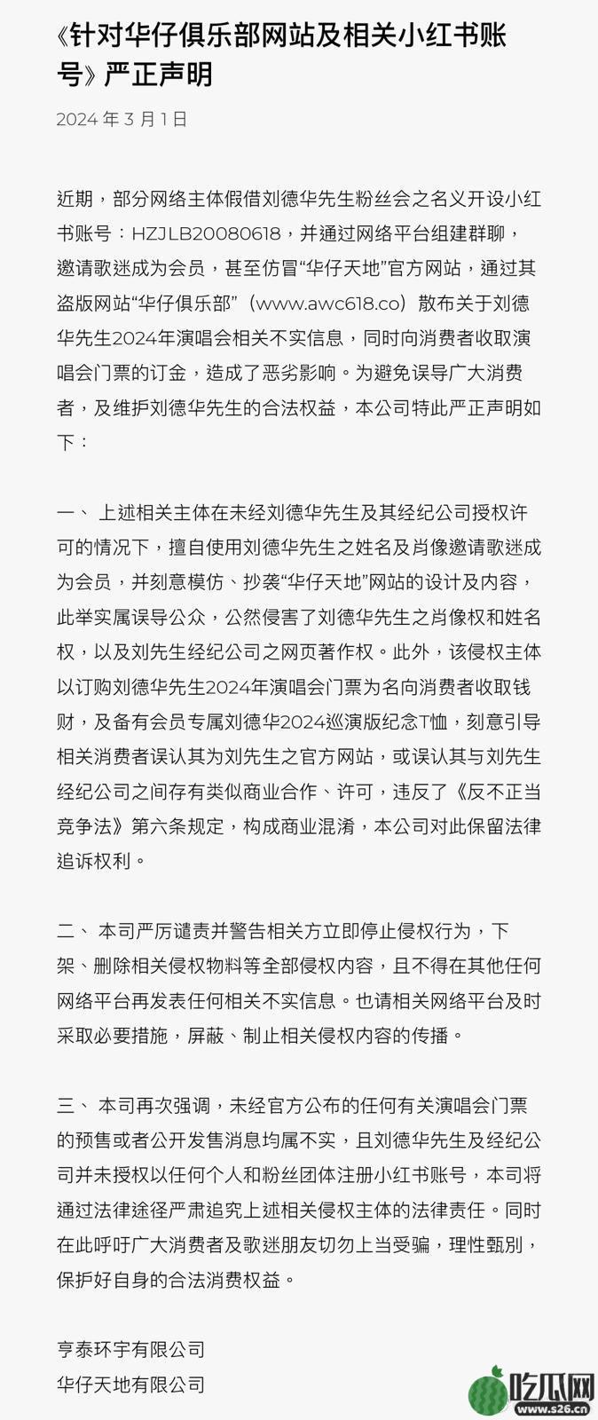 映艺娱乐昨晚发出一则《针对华仔俱乐部网站及相关小红书帐号》的声明,声明中指出近日,部分网络主体假借刘德华先生粉丝会之名义开设小红书账号:HZJLB20080618,并通过网络平台组建群聊,邀请歌迷成为会员,甚至仿冒“华仔天地”官方网站,通过其盗版网站“华仔俱乐部”(www.awc618.co)散佈关于刘德华先生2024年演唱会相关不实信息,同时向消费者收取演唱会门票的订金,造成了恶劣影响。为避免误导广大消费者,及维护刘德华先生的合法权益,因此发出严正声明。文章源自吃瓜网https://www.17gua.com/吃瓜网-https://www.17gua.com/77793.html