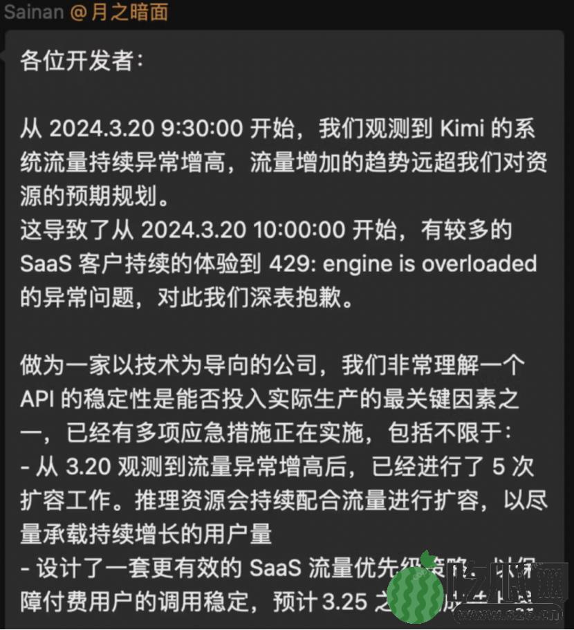 3月21日,月之暗面旗下大模型应用Kimi的AP P和小程序一度出现无法正常使用。月之暗面宣布,自20日以来,Kimi的系统流量持续异常增高,流量增加的趋势远超预期规划。公司已经进行了5次扩容工作,推理资源会持续配合流量进行扩容,以尽量承载持续增长的用户量。